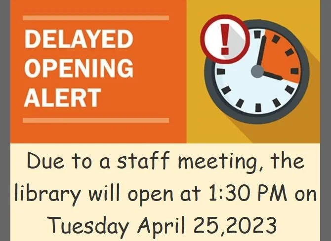 Please be aware that the library will open at 1:30 PM on Tuesday, April 25th.